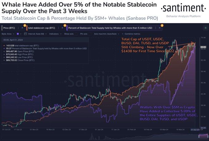 According to Santiment, top stablecoins have been a center of interest for whales thanks to the significant accumulation being experienced.