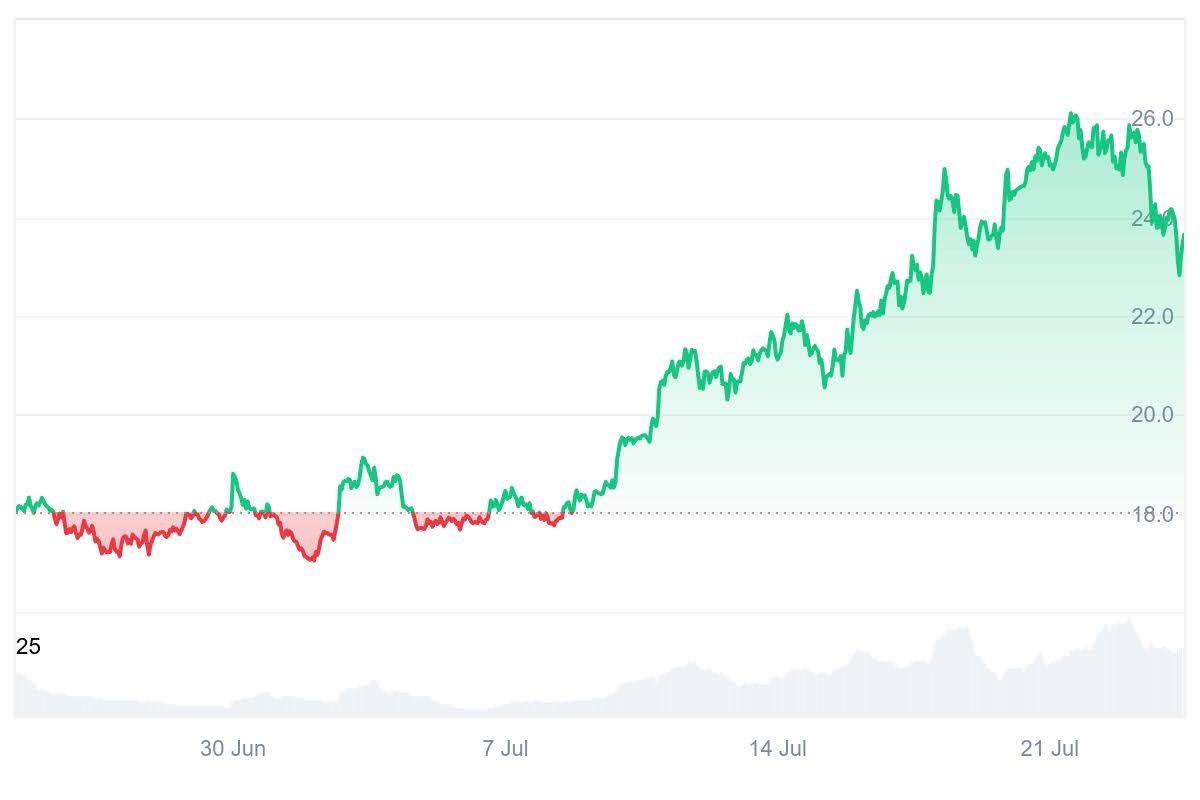 AVAX recently shot up 30% in the last 30 days, and was trading above $25; experts think it could easily hit $30 soon.
