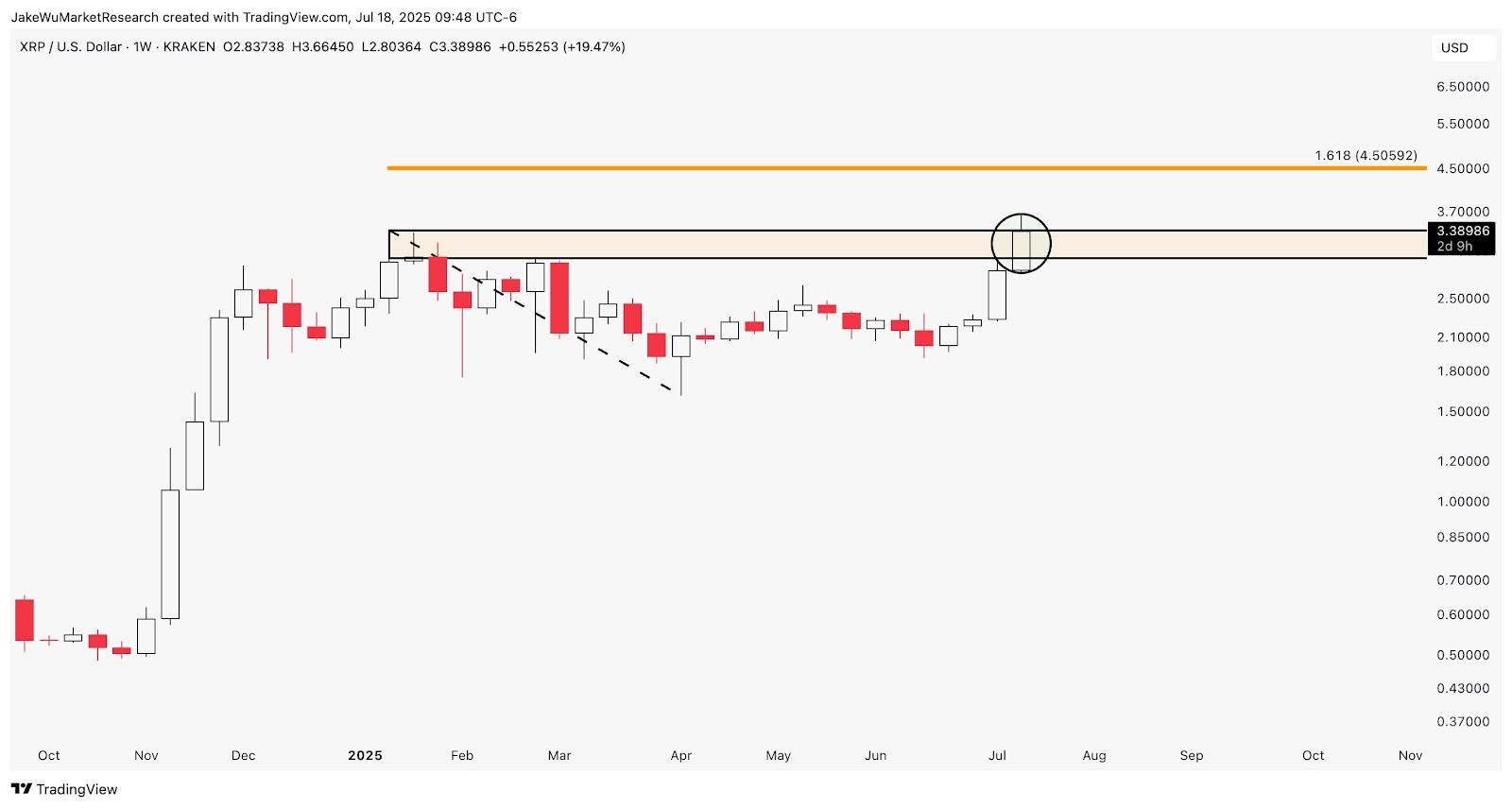 Still, Ripple must compete in the cross-border remittance space, facing quiet rivals that are evolving quickly. Analysts on X (formerly Twitter) have said that If XRP price can close above this previous high at $3.40 on the weekly candle, the 1.618 extension is the upside target at $4.50.