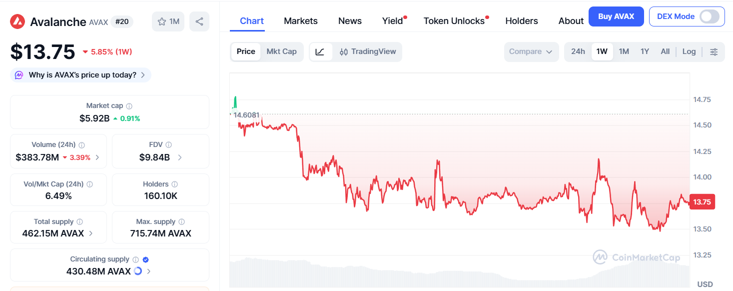 Once a top altcoin to buy, AVAX, is now losing the gains from the first week of the year. After a strong rally from $12 to $14.83, the crypto is in pullback mode. At press time, Avalanche is trading at $13.79, down nearly 8.80% from recent highs. The market structure shows repeated rejections at $15 resistance levels, with the price pulling back at each rejection.