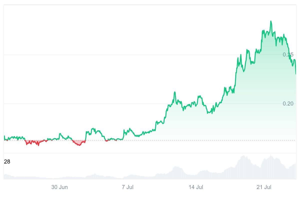 Solana’s growth from April lows at $123 has been nothing short of astonishing. LetsBonk and PumpFun have gradually brought back the nostalgic meme craze, and the meme king isn’t left out of the excitement. This month alone, Dogecoin has risen by 50% to a quarterly high of $0.25.