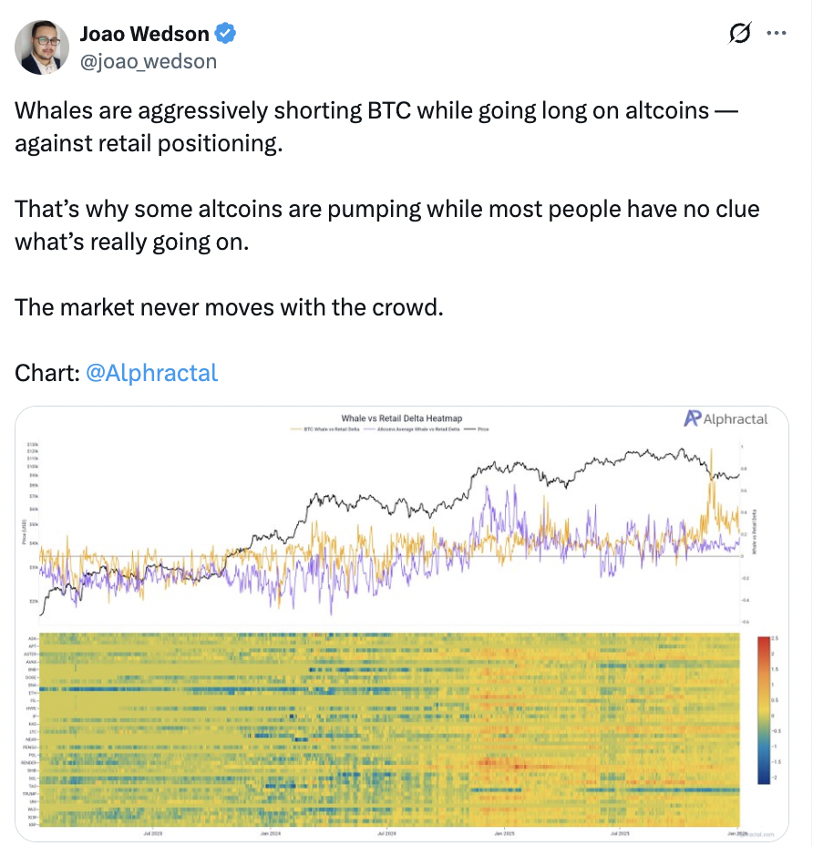 Additionally, Wedson pointed out that whales are increasingly shorting Bitcoin while going long on altcoins, a pattern often seen near the early stages of altcoin-led cycles. This behavior suggests that smart money may be preparing for relative outperformance outside of BTC, rather than betting on Bitcoin dominance alone.