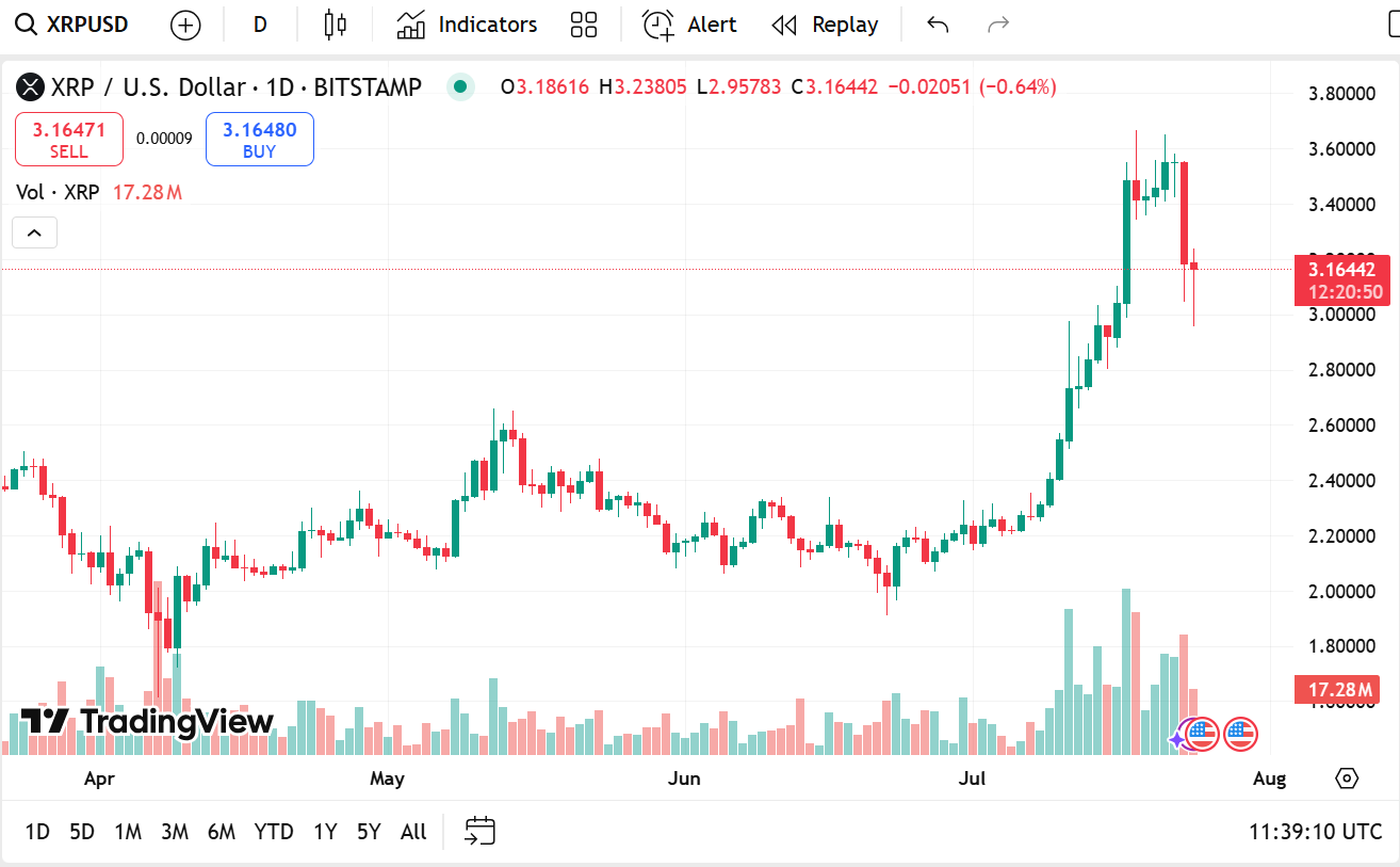 XRP has been a constant in the crypto universe for quite some time, with praise for its application in cross-border payments and victory in court over the SEC. Yet even traditional tokens are not exempt from investor mood swings. As of now, XRP has dipped below $3, now selling at $3.10, a decline of 9.92%, though it recorded an astronomical 146.97% increase in day-to-day trading volume to more than $17.19 billion.